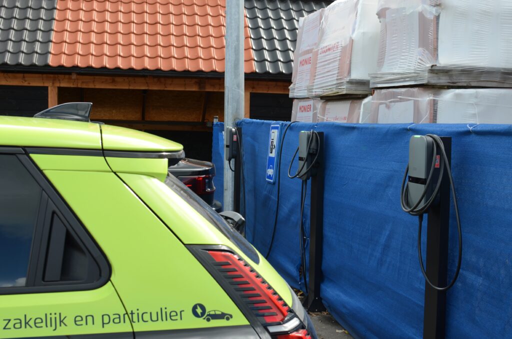 De drie Peblar laadpunten staan elk op een eigen paal. En die laadpalen staan ditmaal direct op de ondergrond. Dat spaart betonvoeten uit.