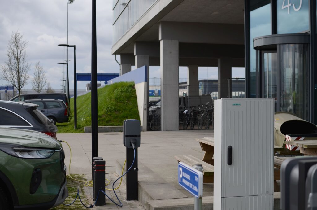Volop laadgelegenheid bij het kantoorgebouw, voor eigen auto’s maar ook die van bezoekers. De verduurzamingsopgave speelt immers overal. Het gaat niet alleen om tien laadpunten van Peblar, maar ook om alles wat verder nodig is om het opladen goed en veilig te laten werken.