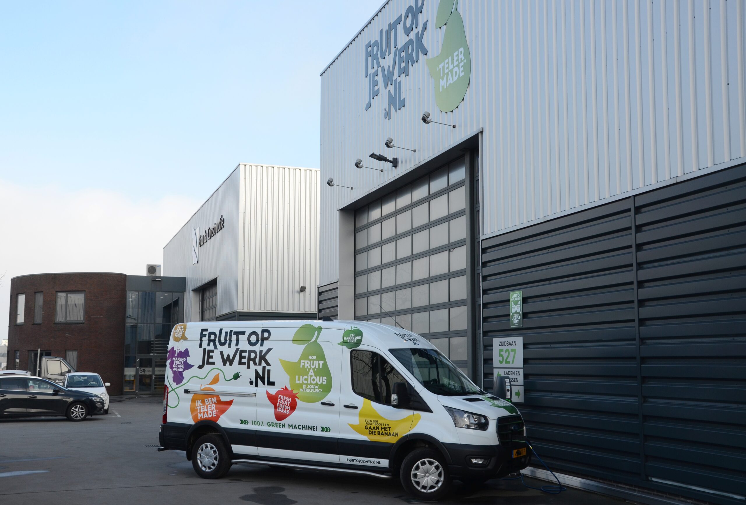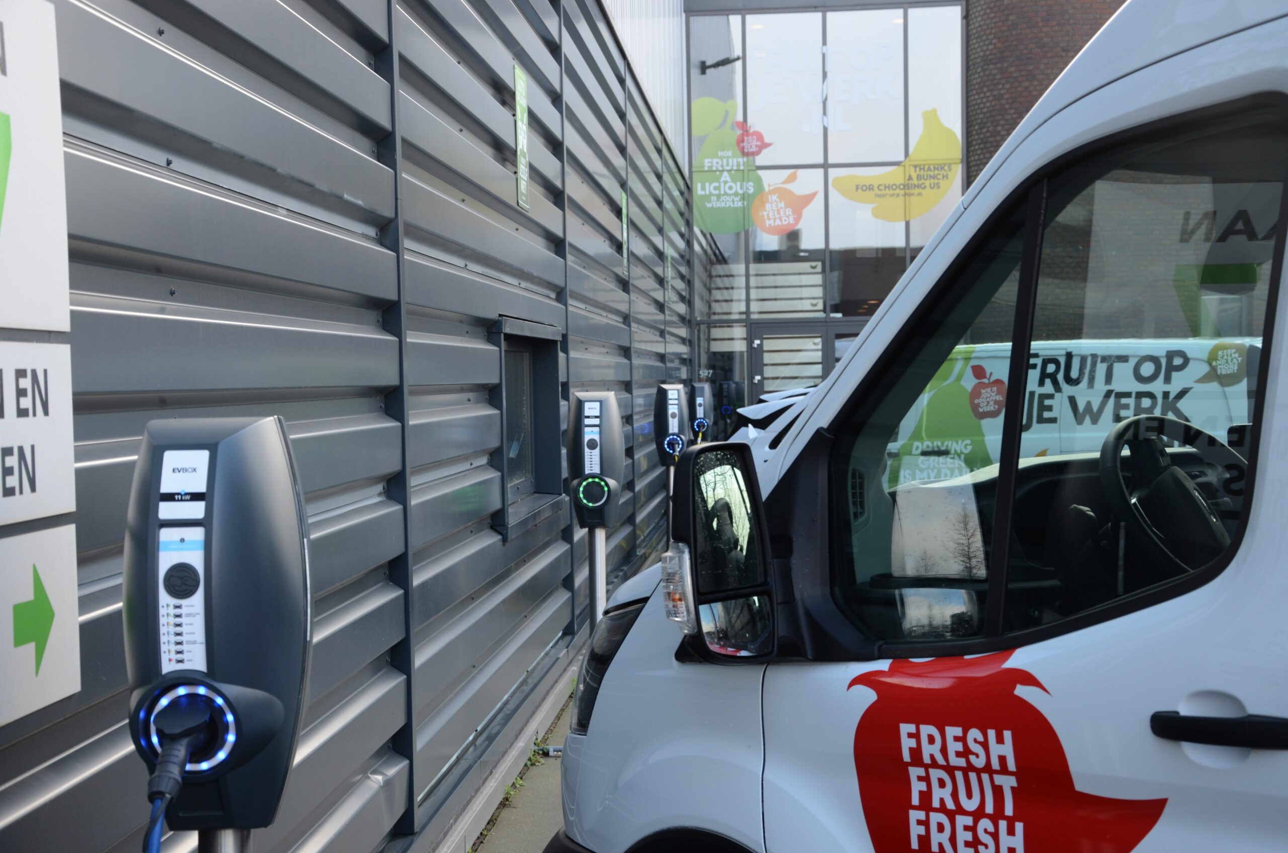 Bij de vestigingen van Fruit op je werk in Best en Moordrecht hebben wij gezorgd voor laadpunten. De keuze is gevallen op de EVBox BusinessLine. In Best gaat het om drie dubbele laadpunten, dus zes aansluitingen in totaal. Op de locatie in Moordrecht zijn eerst vier dubbele laadpunten geplaatst aan de voorzijde van het gebouw, maar binnen een jaar zijn er nog eens twee dubbele laadpunten bijgekomen aan de zijkant van het pand.