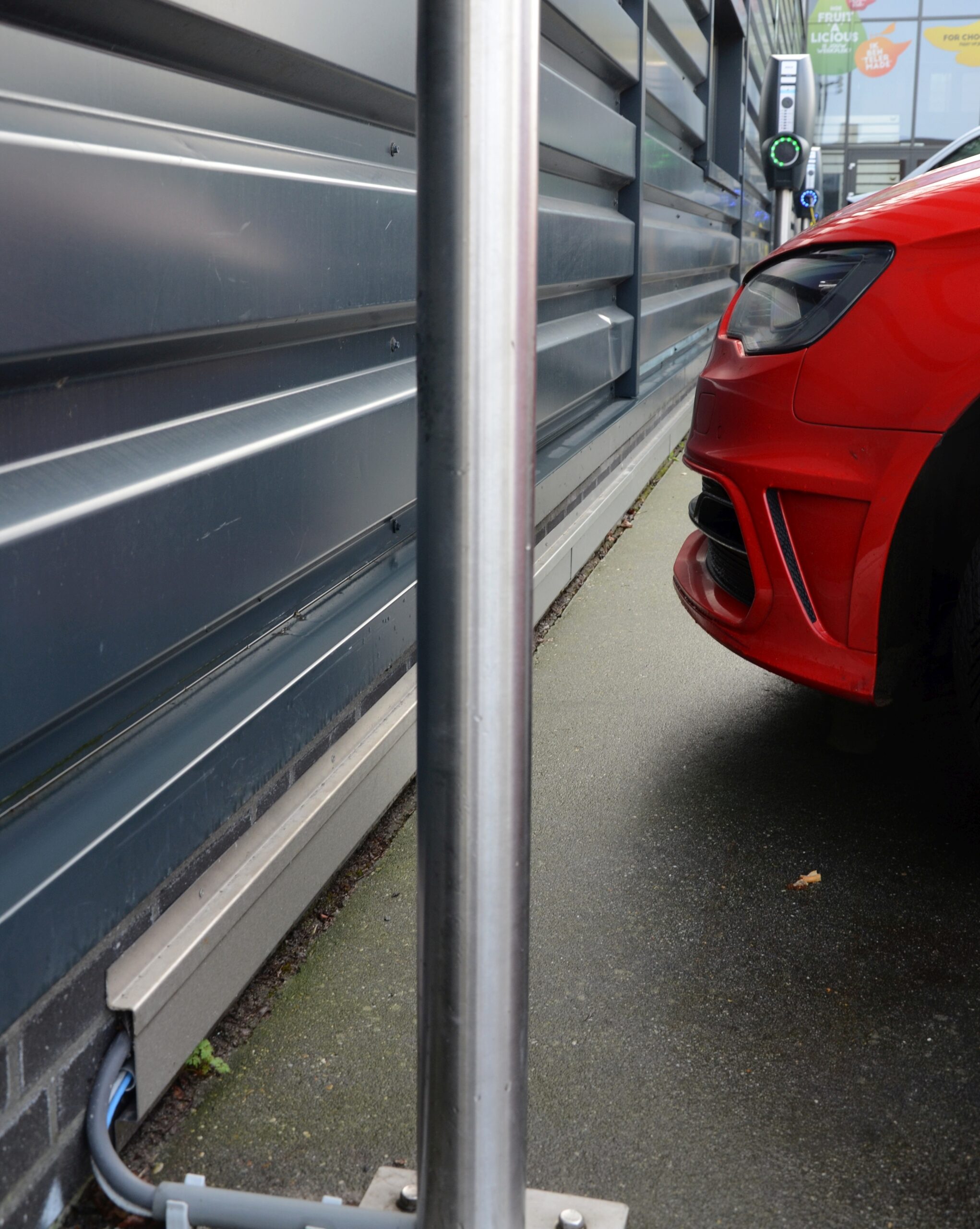 De laadpunten staan stuk voor stuk op een paal. Die palen zijn direct op het asfalt gemonteerd. Aan de zijkant van het pand gaan de stroomkabels gelijk naar binnen op maaiveldniveau. Voor is de bekabeling weggewerkt achter een rvs-goot.