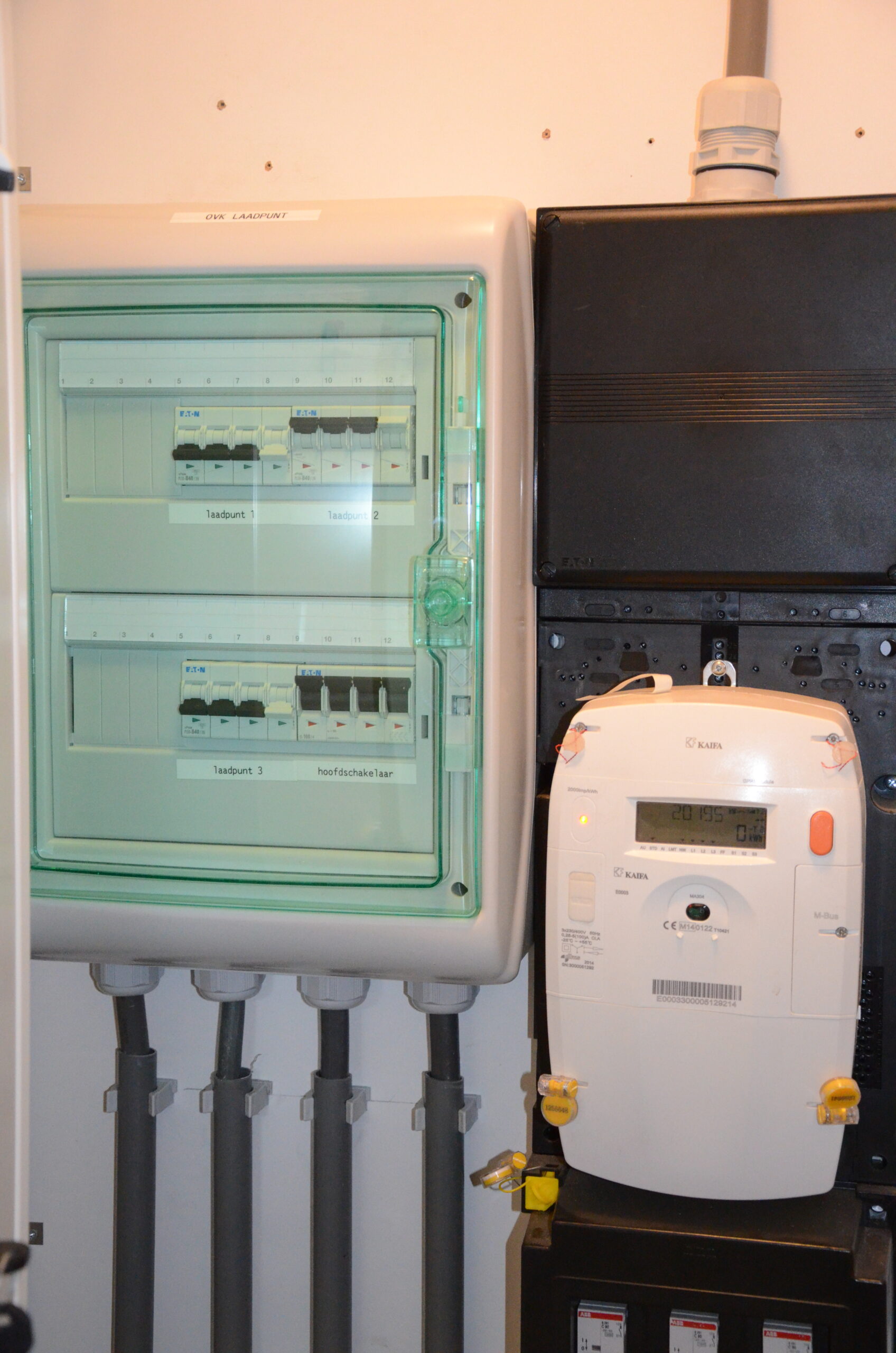 Wij hebben namelijk alle werkzaamheden gedaan, maar bij het opstellen van de offerte is overeengekomen dat de huiselektricien de verzwaring uitvoert. Als de hoofdschakelaar is gewisseld voor een exemplaar met een grotere capaciteit en de netbeheerder het werk heeft gedaan, kunnen de laadpunten op maximaal vermogen worden ingesteld.