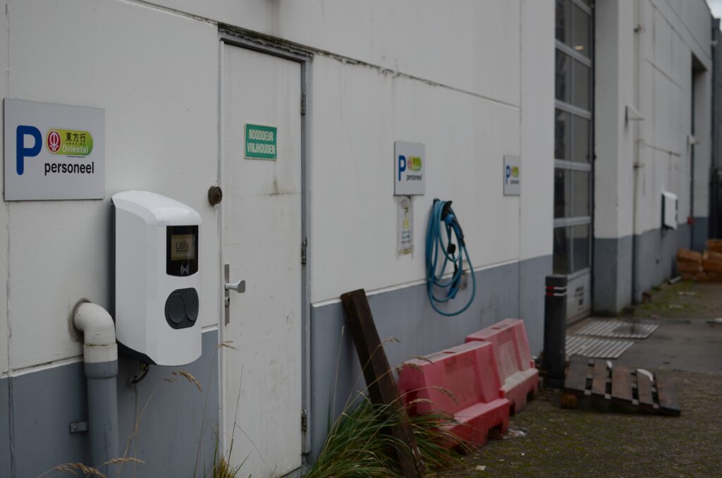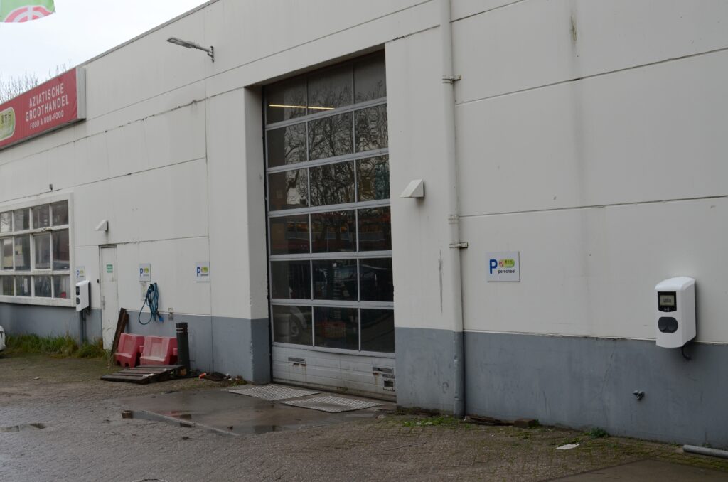 Een groothandel voor Aziatische producten. Bedoeld voor professionals uit het horeca-wezen die aanzienlijke hoeveelheden afnemen. En dat levert uiteraard de nodige activiteit op. Dat is merkbaar aan de achterzijde. Het gaat er niet zozeer om dat alles er perfect uitziet, maar het is doelmatig. Alles moet werken. En voldoende efficiënt verlopen. Twee roldeuren geven toegang tot het magazijn. Twee dubbele laadpalen van Alfen zijn er om auto’s op te laden, wij kwamen deze laadpalen installeren.
