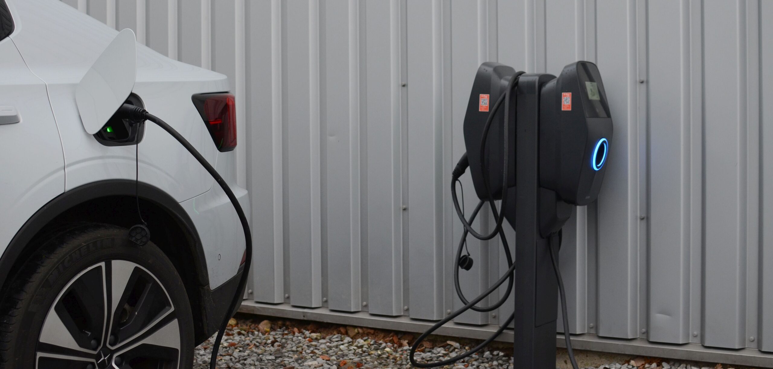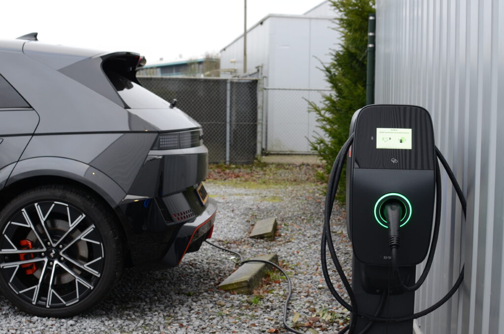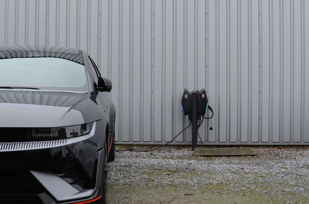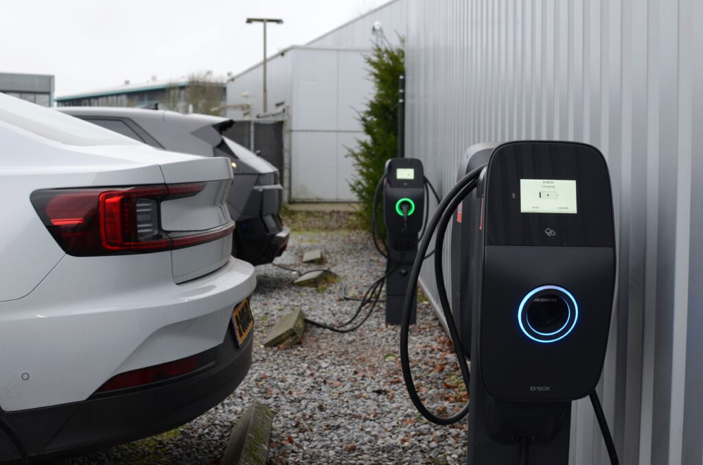 De vier nieuwe laadpunten van EVBox zijn op de achterzijde van het terrein geïnstalleerd. Uiteindelijk is gekozen voor montage op een paal. Het beplatingsmateriaal van de hal is vrij dun en daardoor niet geschikt voor het ophangen van de laadpunten.
