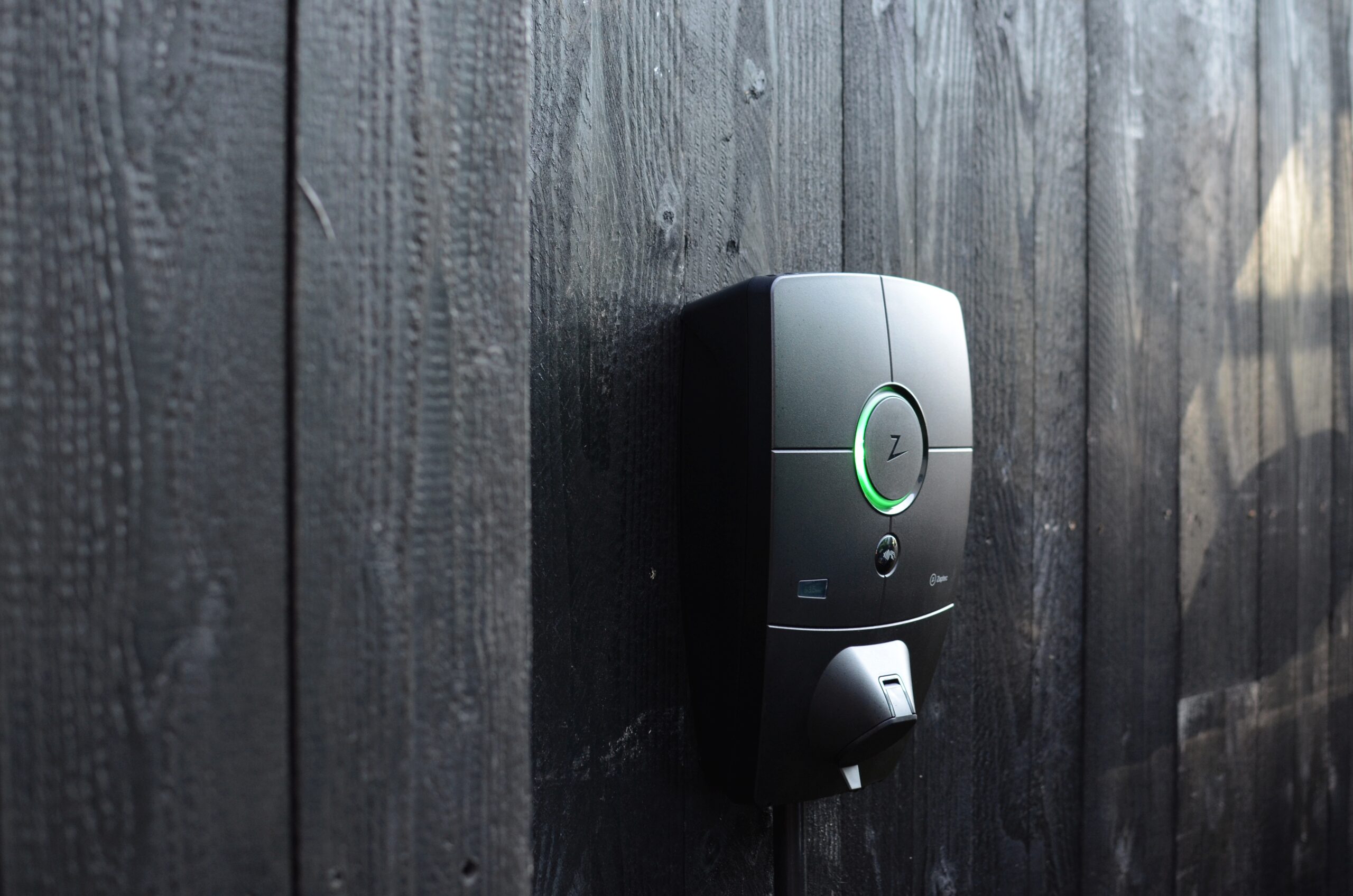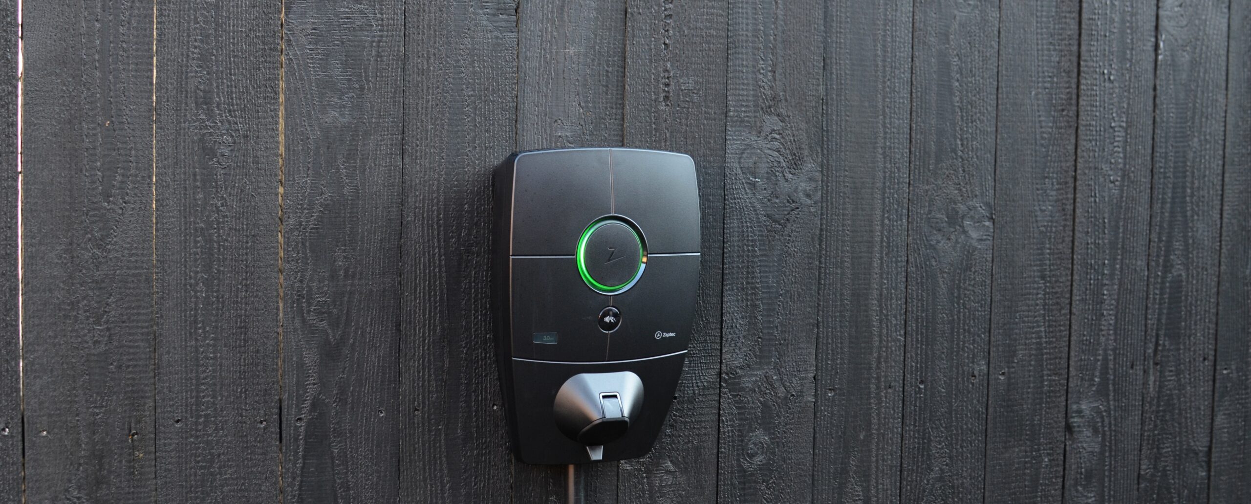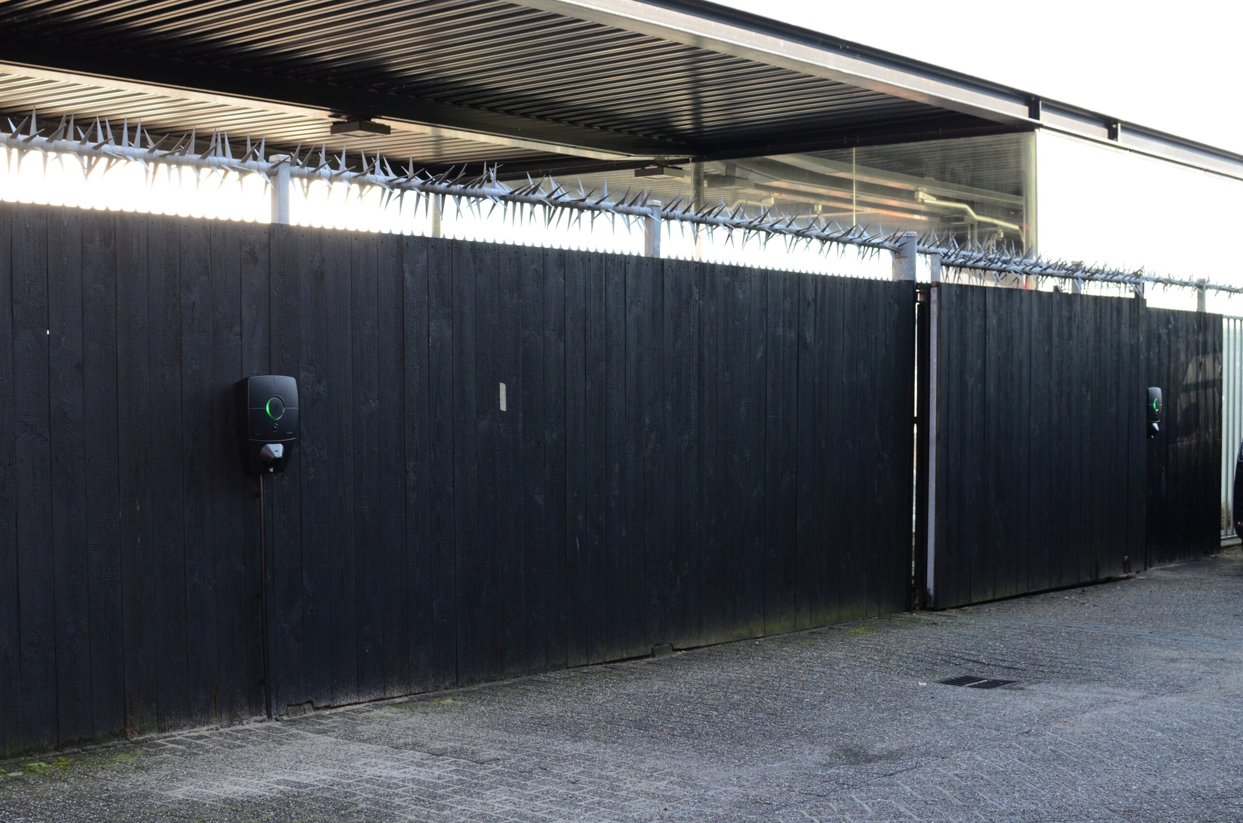 De beide laadpunten zijn gemonteerd op een zwarte schutting. Mooi om te zien is dat niet uitsluitend de Zaptec Pro geheel zwart is, maar dat de bekabeling is weggewerkt in een buis die eveneens zwart is. Wat op een belangrijke manier bijdraagt aan de hoogwaardigheid van de installatie.